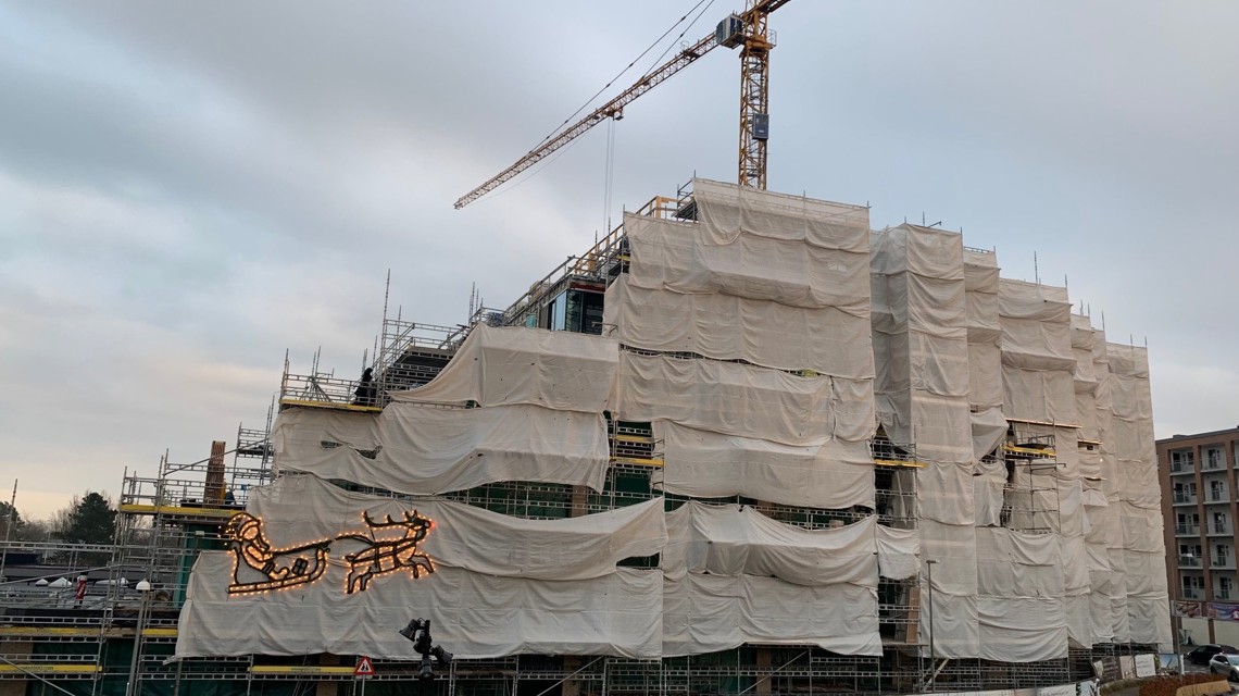 Den knap så æstetiske indpakning, som i øjeblikket kendetegner byggeriet på Kastaniehjørnet, tager sig i løbet af december noget hyggeligere ud. Der er nemlig blevet opsat julebelysning på bygningen til at sprede lidt glæde i årets mørkeste tid.